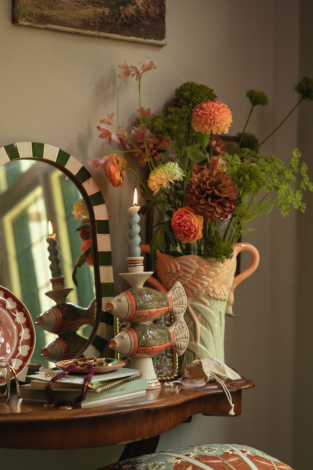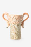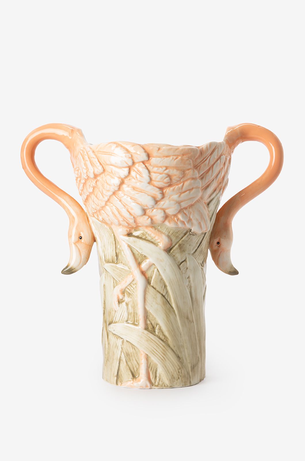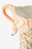 Mehrfarbige Flamingo-Vase der Marke Sissy-Boy. Die Vase hat die Farben Aprikot, Rosa und Grün und Henkel in Form eleganter Flamingohälse, die nach unten geneigt sind. Maβe: 30,5 cm. Material: 100% Steinzeug.