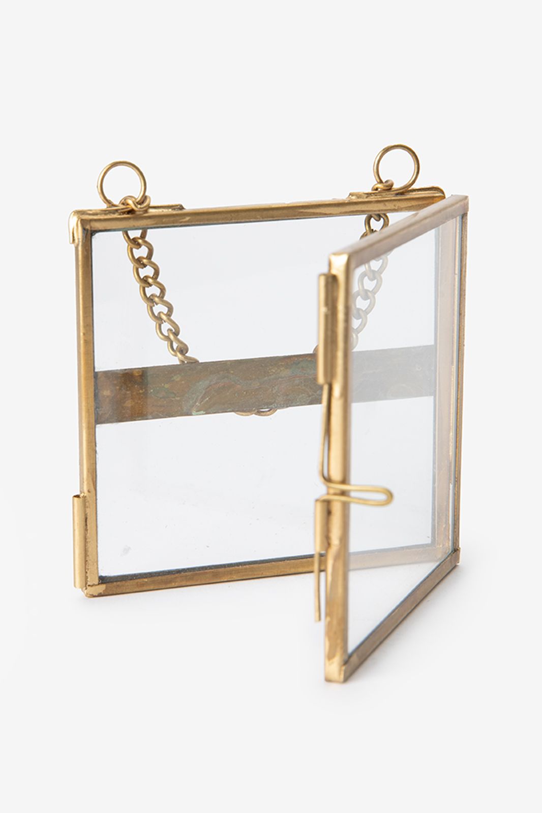 Goldfarbener Metall-Fotorahmen der Marke Sissy-Boy. Der viereckige Bilderrahmen ist mit einer Kette versehen, an der er sich leicht aufhängen lässt. Der Rahmen misst 7,5x7,5 cm.