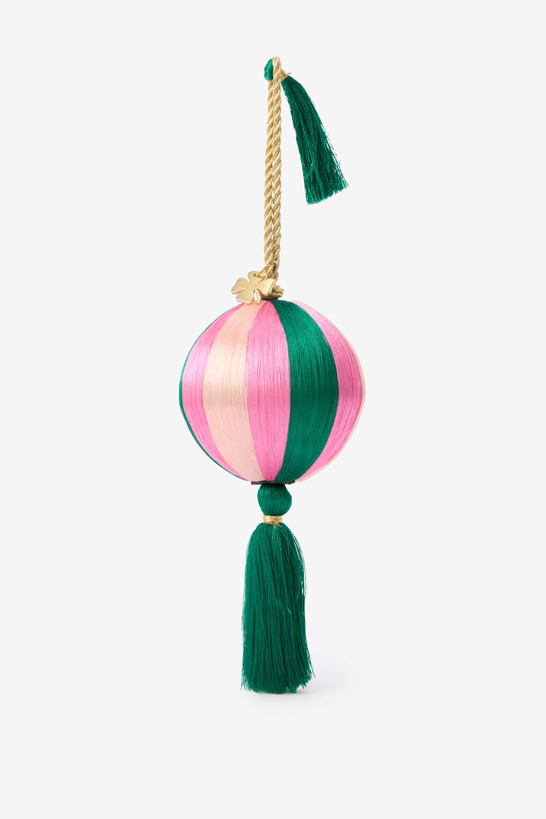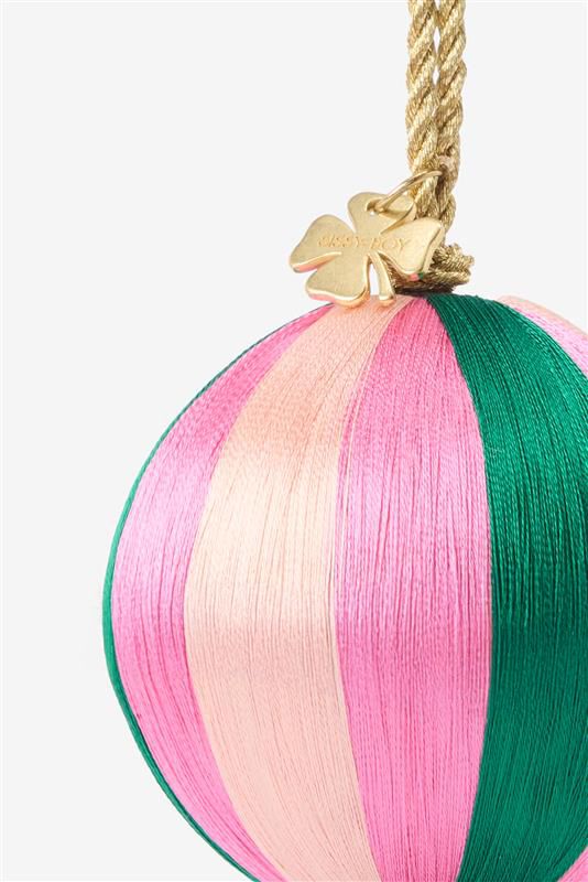 Mehrfarbige Weihnachtskugel mit farbigen Fäden der Marke Sissy-Boy. Die Kugel hat die Farben Hellrosa, Rosa und Grün und ist auf der Unterseite mit einer grünen Tassel versehen. Maβe: 7 cm. Material: 50% Polyester, 50% Plastik.
