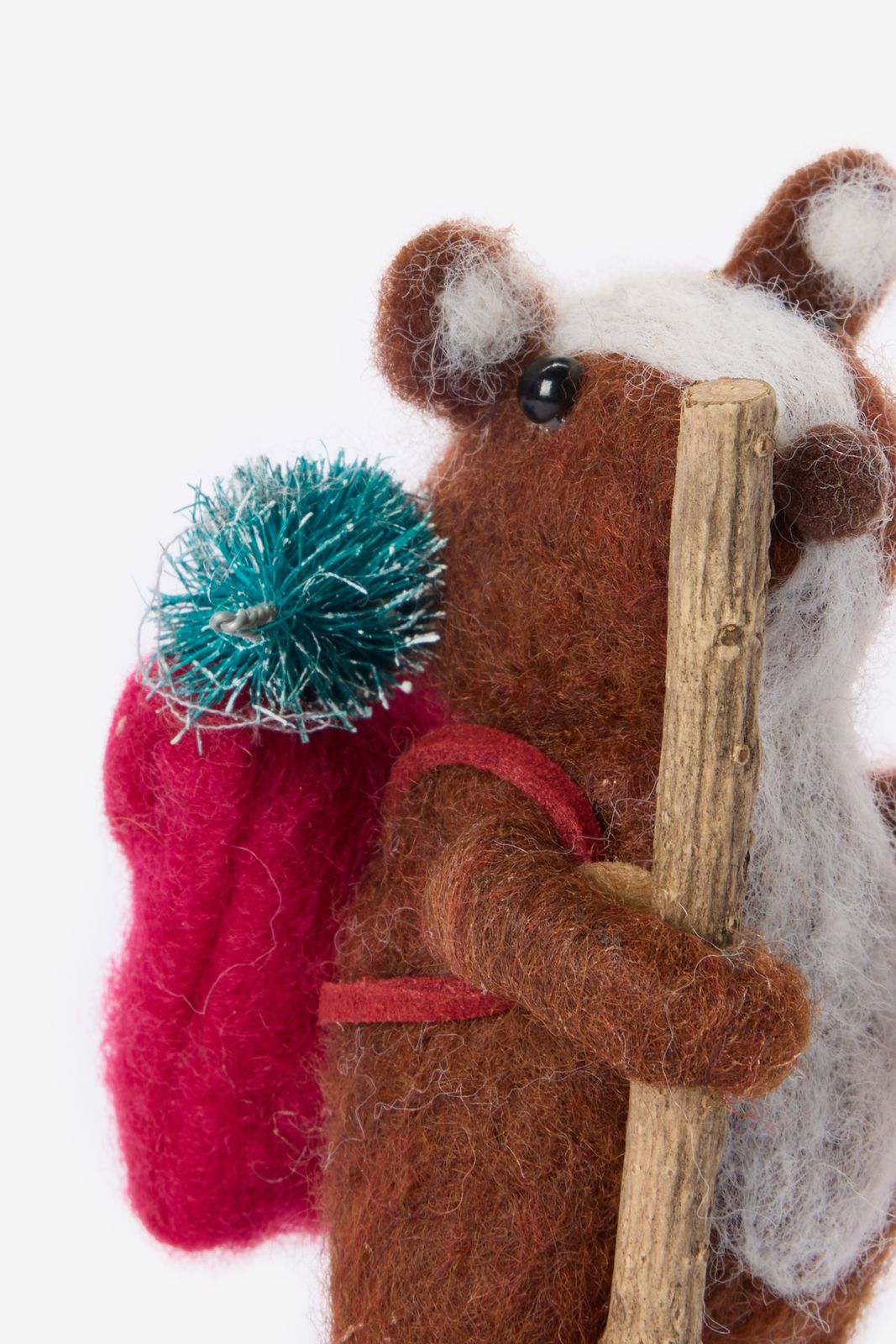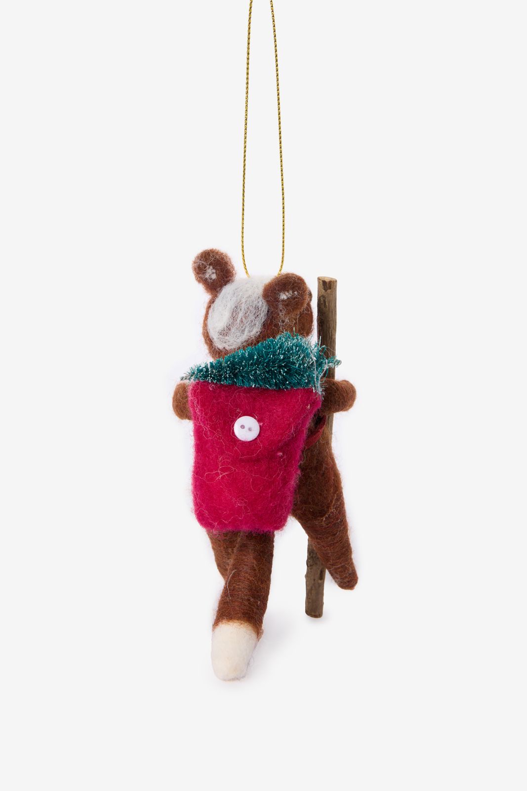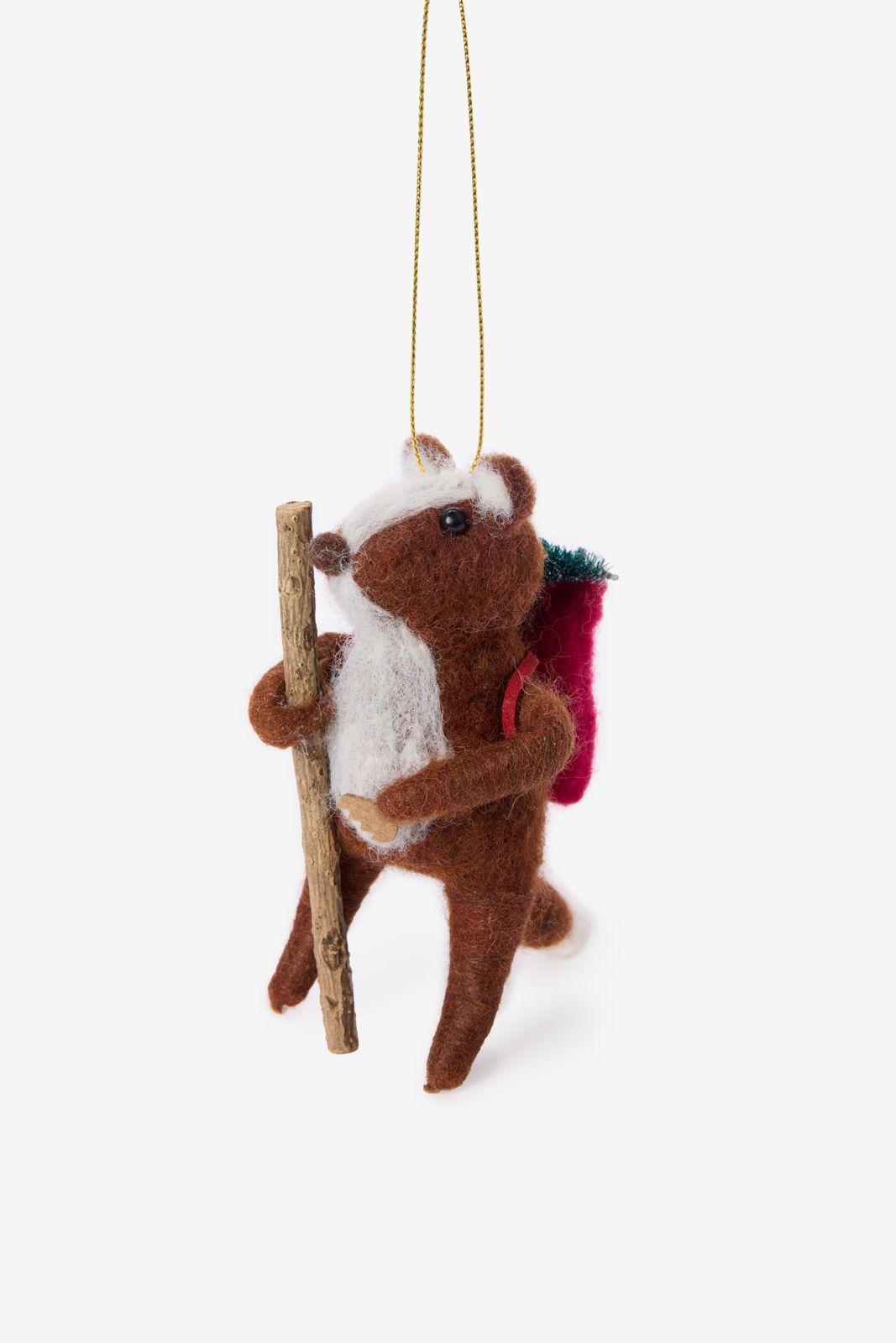 Weihnachtsornament der Marke Sissy-Boy. Das Ornament hat die Form eines kleinen braunen Dachses mit einem Rucksack auf dem Rücken und einem Stock in seiner Pfote. Länge: 11 cm. Material: 100% Filz.