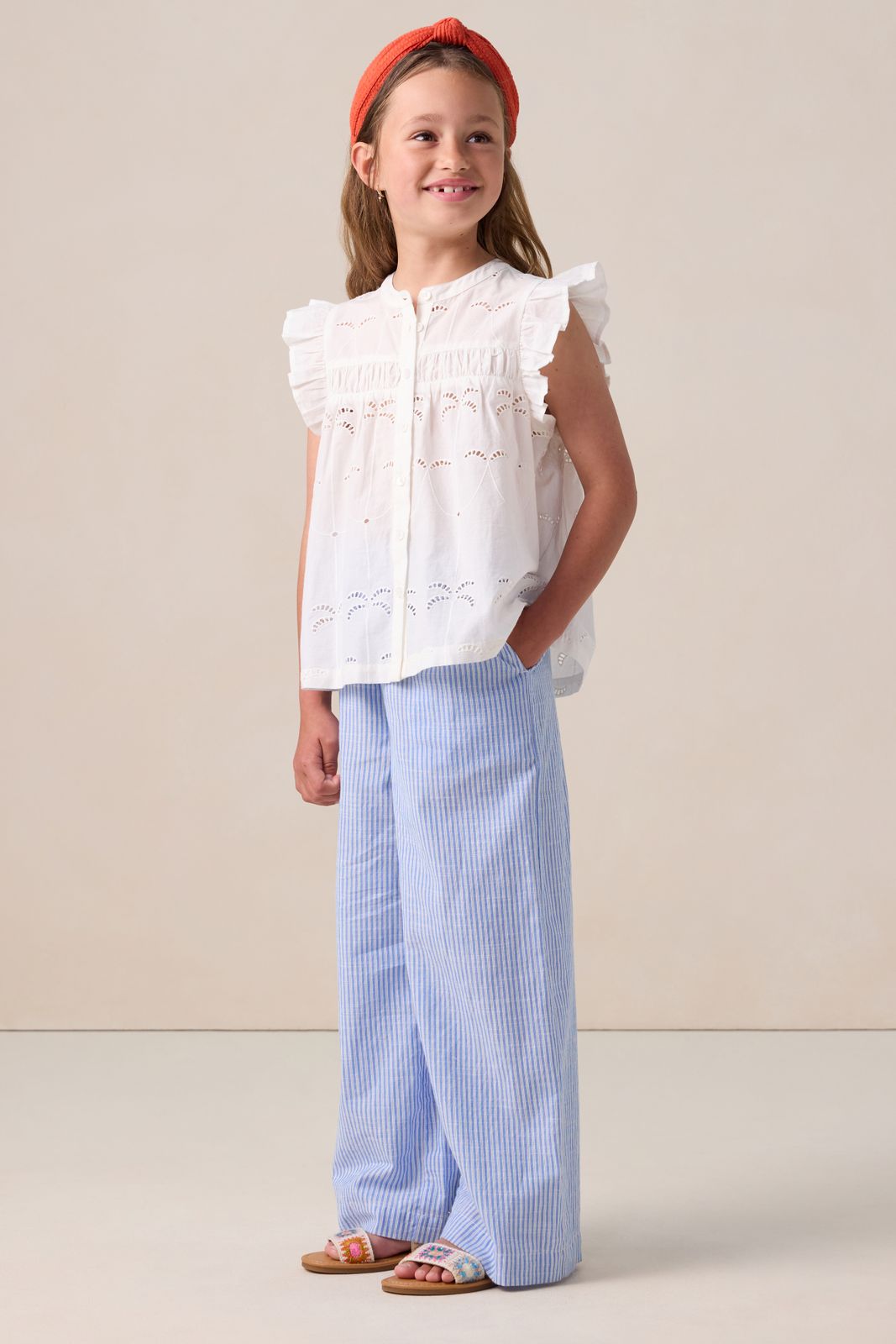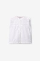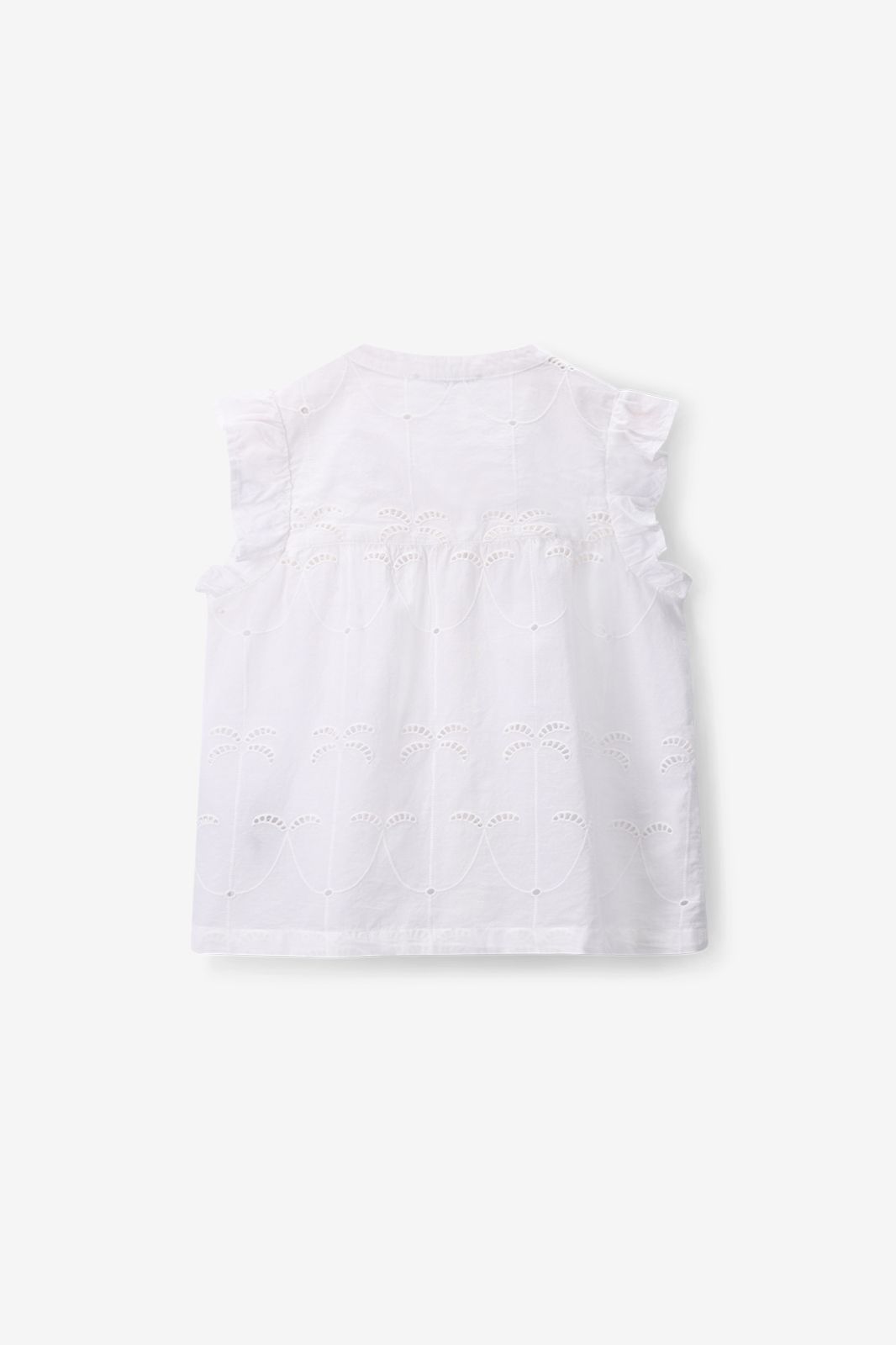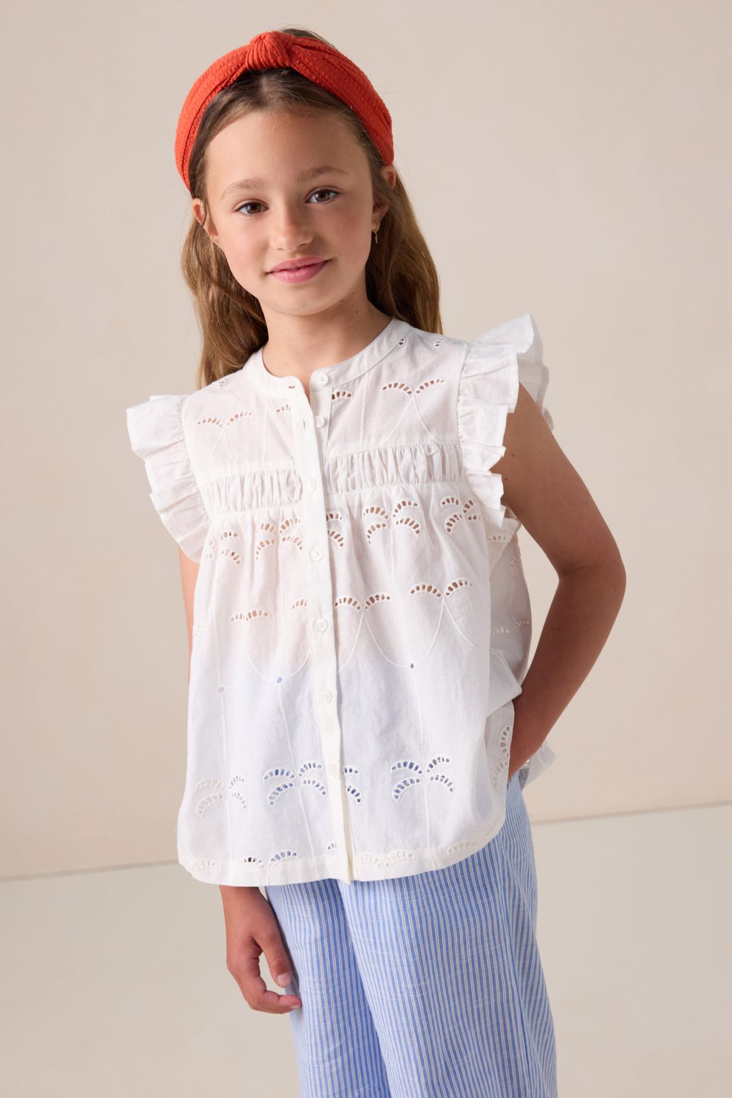 Weiße Bluse mit Palmenmuster der Marke Sissy-Boy. Die Bluse hat einen runden Ausschnitt, kurze Ärmel mit verspielten Volants, eine Knopfleiste und eine wunderschöne Anglaise-Stickerei in Form von Palmen. Material: 100% Baumwolle.