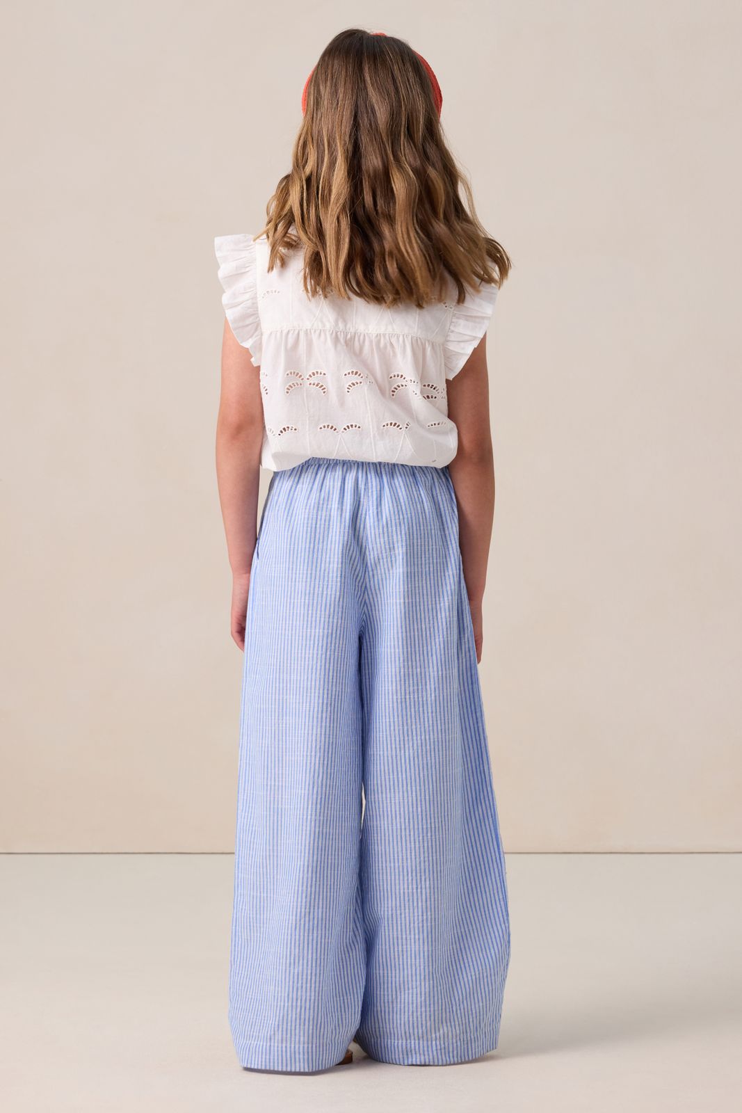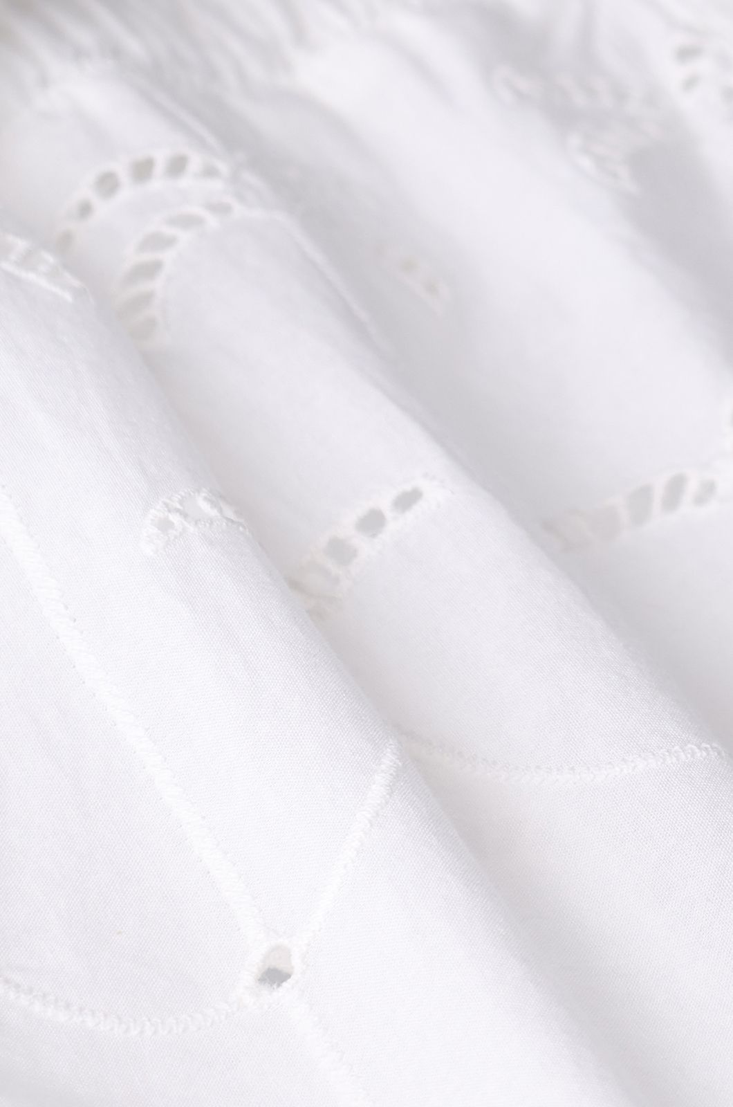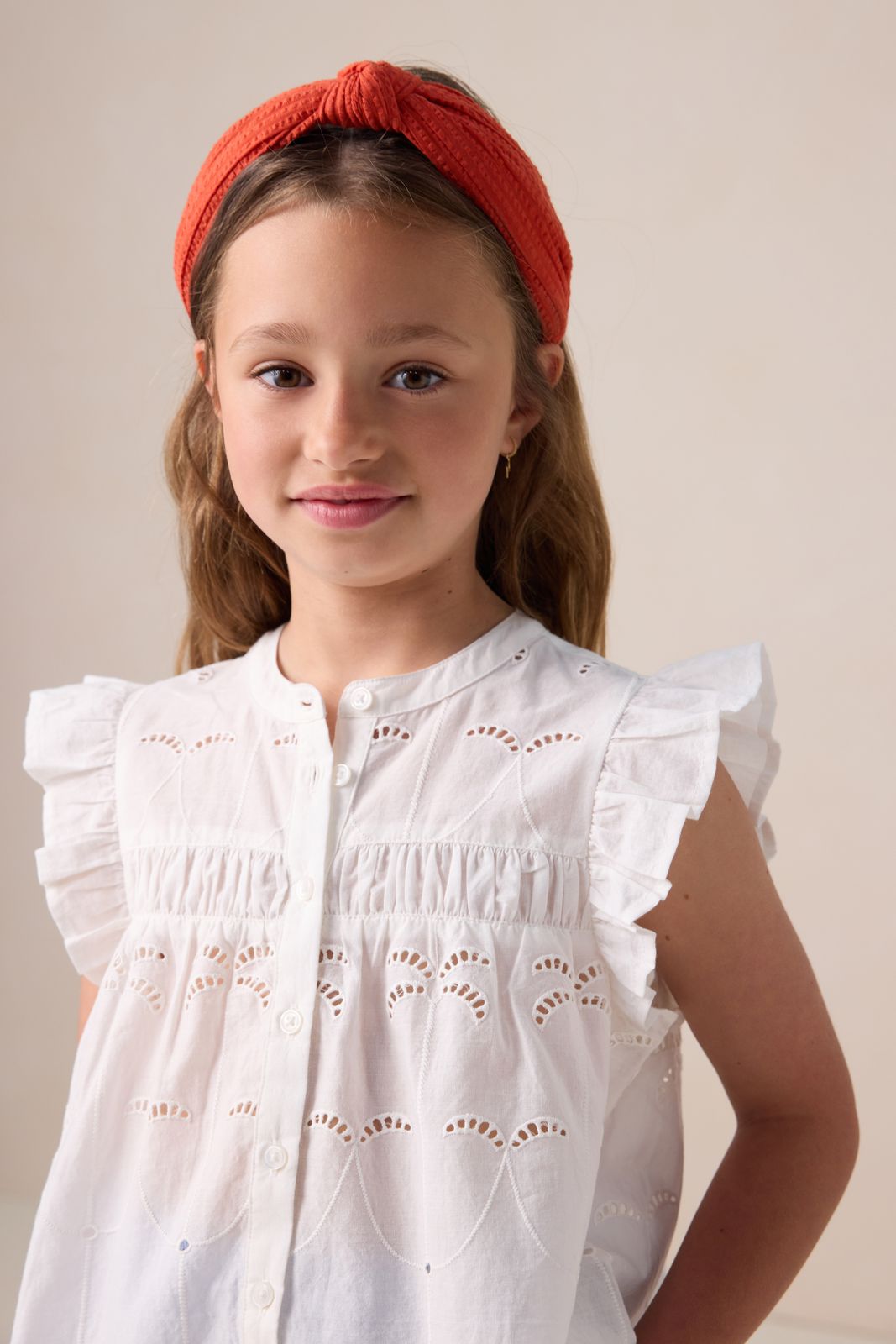 Weiße Bluse mit Palmenmuster der Marke Sissy-Boy. Die Bluse hat einen runden Ausschnitt, kurze Ärmel mit verspielten Volants, eine Knopfleiste und eine wunderschöne Anglaise-Stickerei in Form von Palmen. Material: 100% Baumwolle.