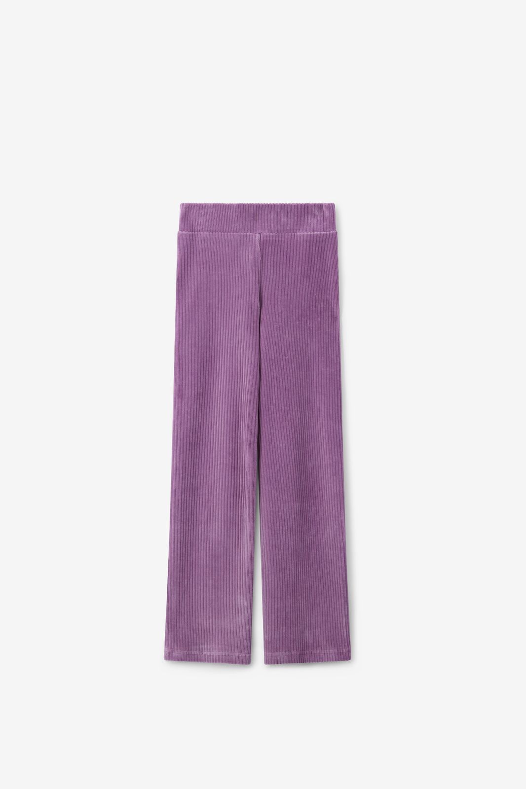 Lilafarbene Cord-Leggings mit geradem Schnitt und elastischem Bund. Material: 75% Baumwolle, 20% Polyester, 5% Elasthan.