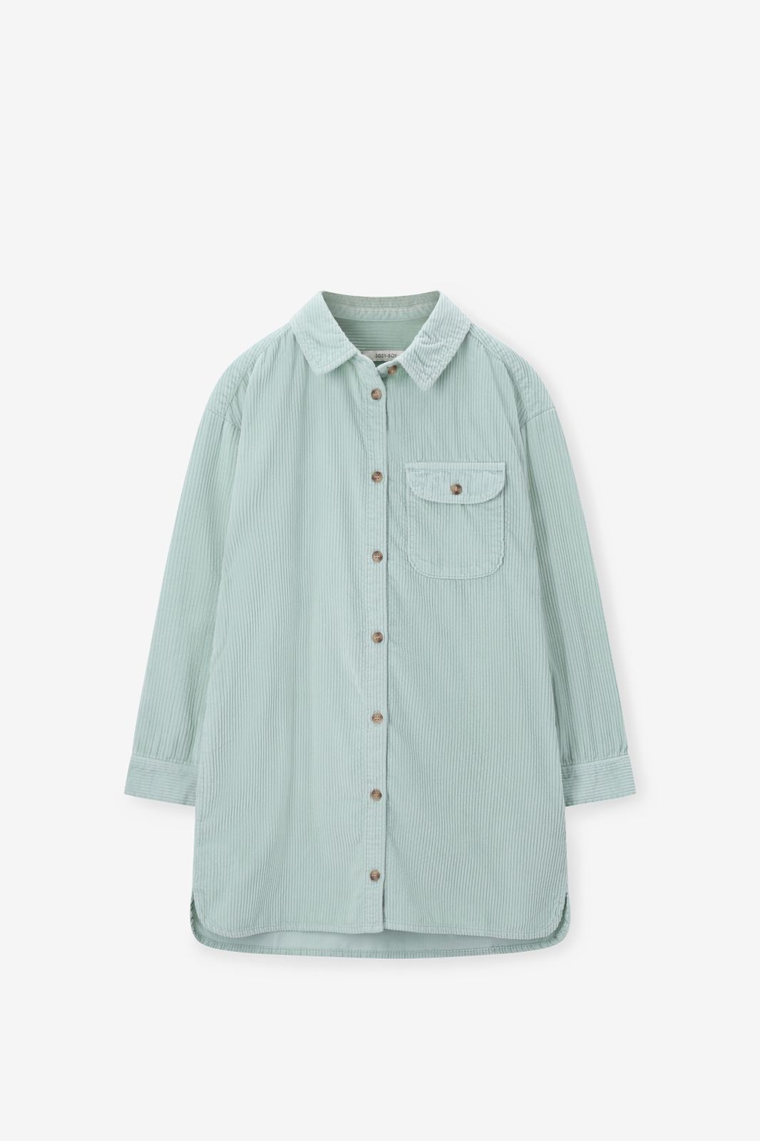 Hellgrünes Cordkleid der Marke Sissy-Boy. Das Kleid hat lange Ärmel, einen Kragen, eine Knopfleiste, eine Brusttasche und einen Relaxed Fit. Material: 100% Baumwolle.