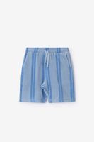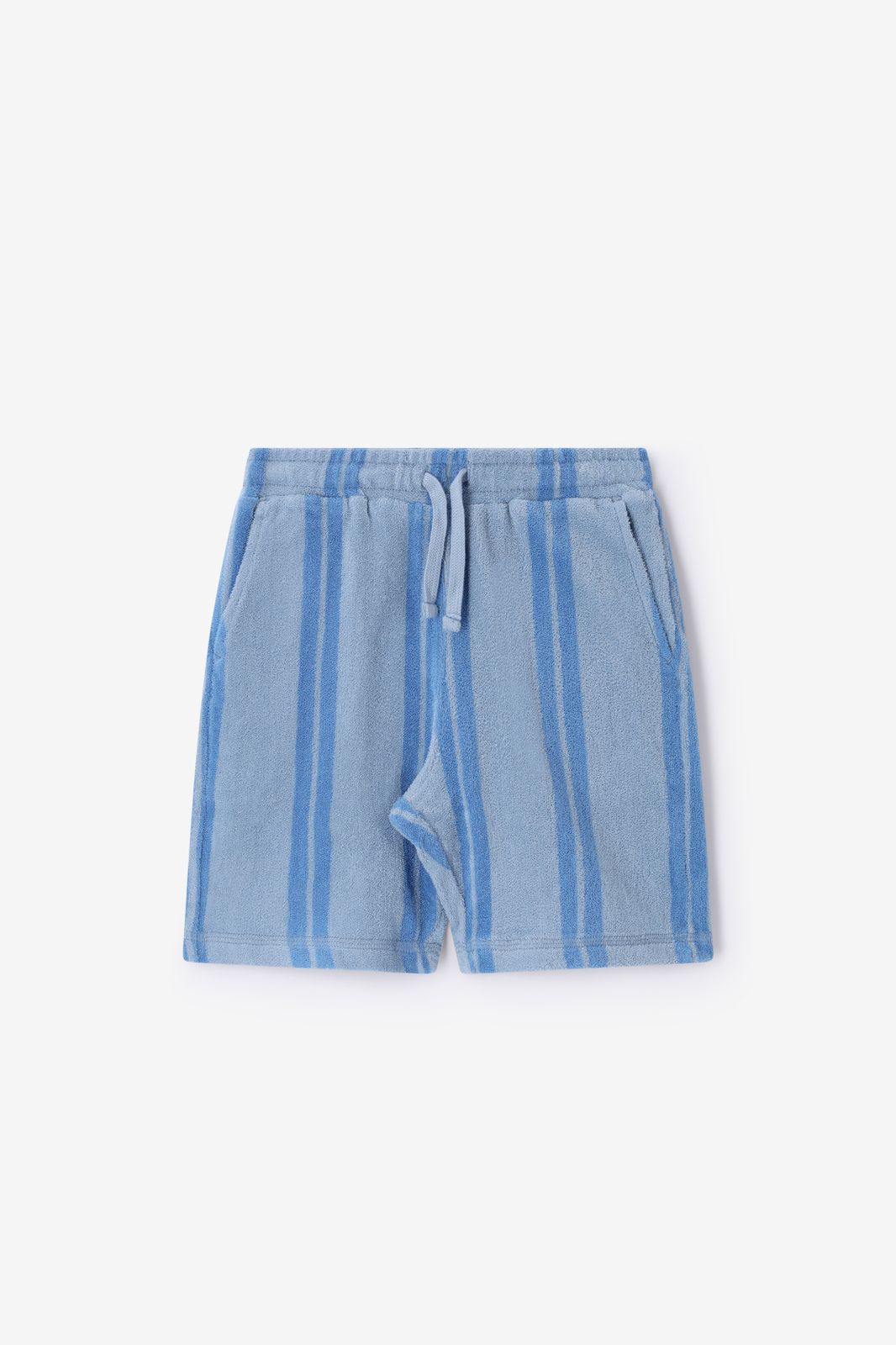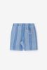 Blaue Nicki-Shorts der Marke Sissy-Boy. Die kurze Hose hat eine mittelhohe Taille, einen elastischen Bund mit Kordelzug, Seitentaschen und eine aufgenähte Tasche mit Aufnäher auf der Rückseite. Die dunkelblauen Streifen machen den lässigen Look der Shorts komplett. Material: 100% Baumwolle.
