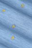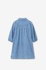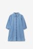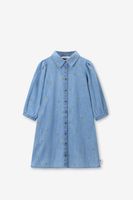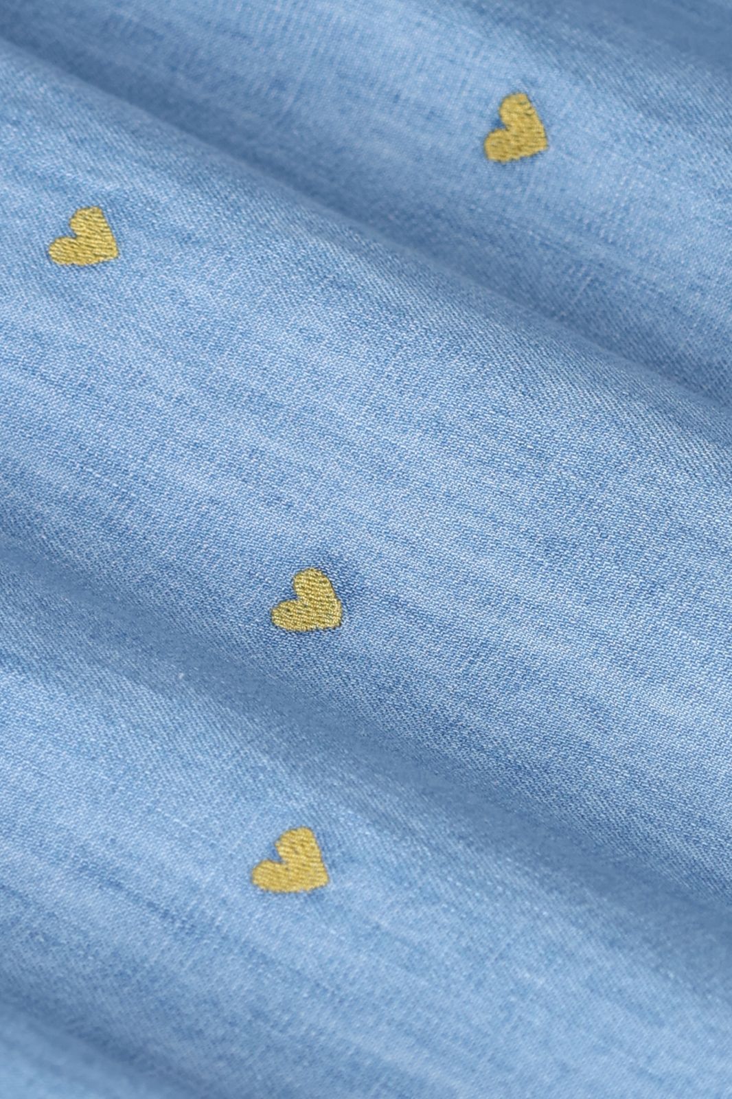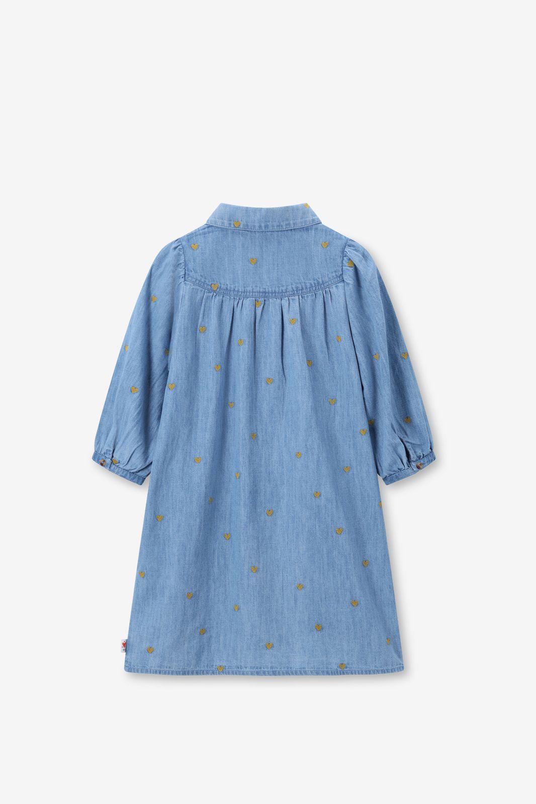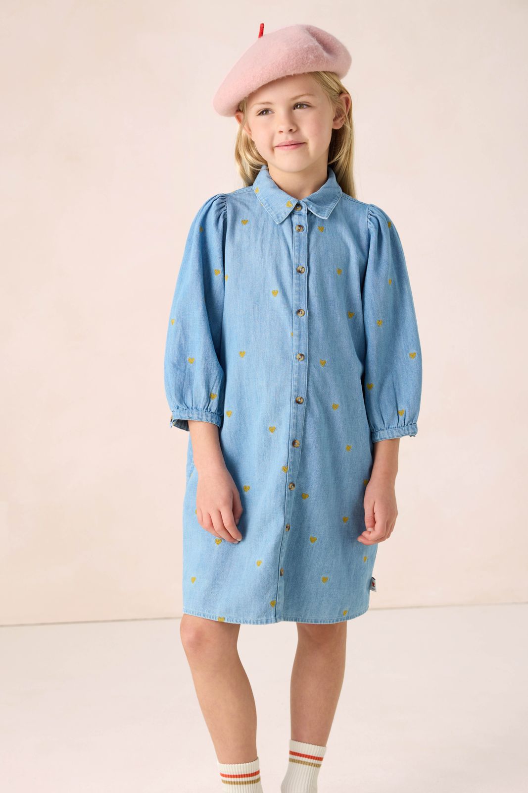 Hellblaues Jeanskleid der Marke Sissy-Boy. Das Kleid hat lange Puffärmel, einen Kragen, eine Knopfleiste und eine wunderschöne goldfarbene Herzstickerei. Material: 100% Baumwolle.
