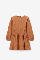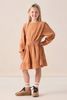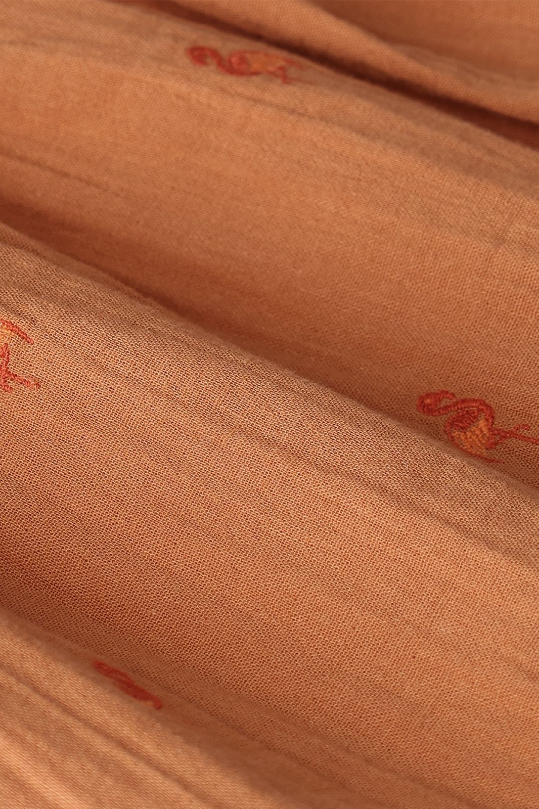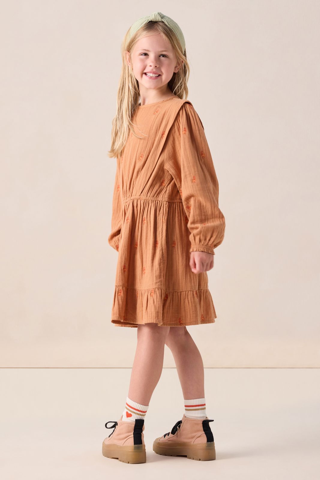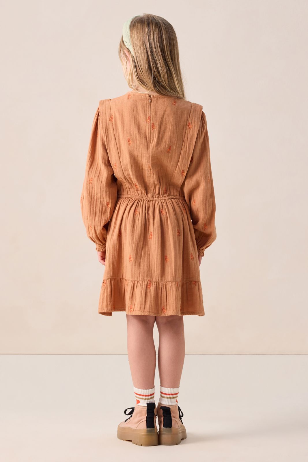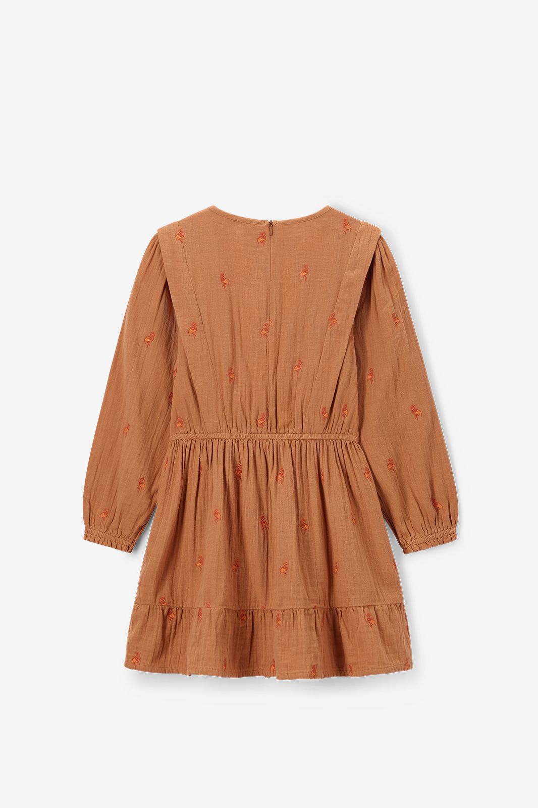 Hellbraunes Kleid der Marke Sissy-Boy. Das Kleid hat lange Ärmel, einen runden Ausschnitt, einen Reißverschluss, einen kurzen Schnitt, einen elastischen Bund und eine wunderschöne Flamingo-Stickerei. Material: 100% Baumwolle.
