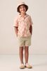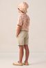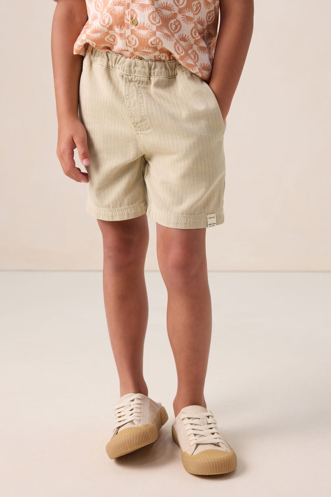 Beigefarbene Shorts mit Fischgrätenmuster der Marke Sissy-Boy. Die kurze Hose hat eine mittelhohe Taille, einen elastischen Bund, zwei Seitentaschen und eine aufgenähte Tasche auf der Rückseite. Material: 100% Baumwolle.