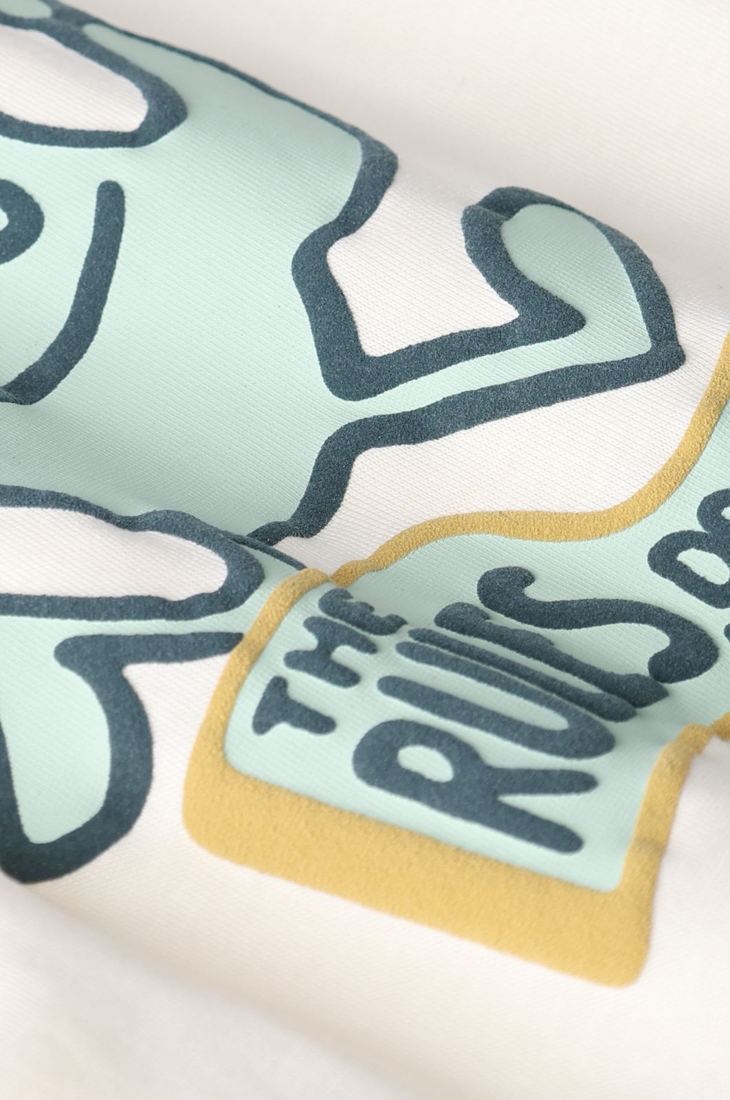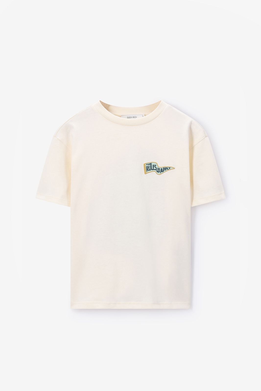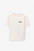 Weißes T-Shirt der Marke Sissy-Boy. Das T-Shirt hat einen runden Ausschnitt, einen Relaxed Fit und ist auf der Vorder- und Rückseite mit einem grafischen Print und blauen und gelben Details versehen. Material: 100% Baumwolle.